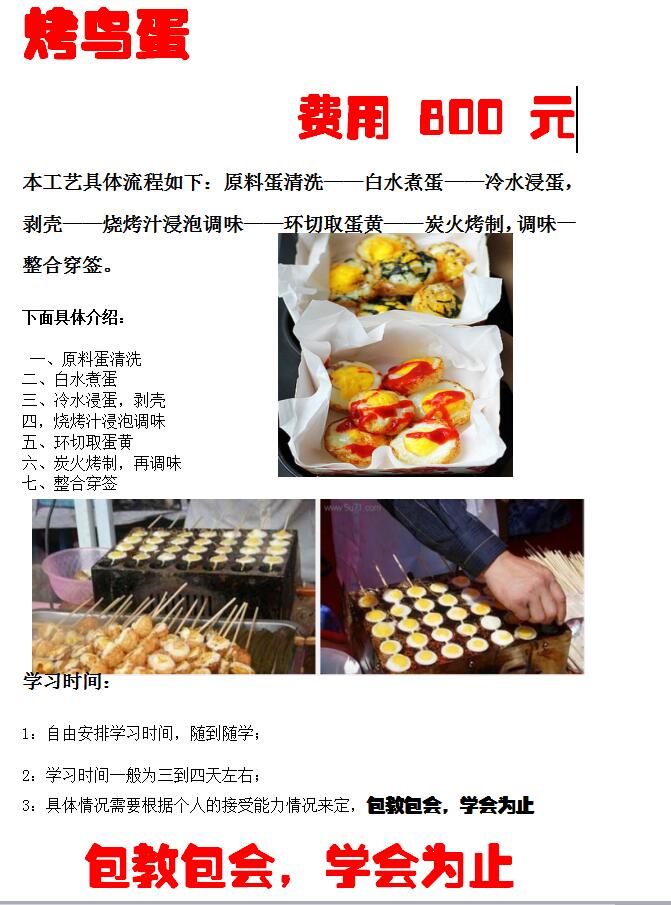 新食玳小吃培训中心烤鸟蛋培训内容:蛋的选择,蛋的烤制技术,小料技术,秘制酱料技术。学习技术都是准确比例配方、现场实际操作、名师手把手教、入学签保会合同、随到随学、学期不限,学会为止、每年技术免费升级、终身技术免费跟踪服务。