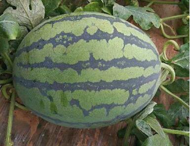 2、果实圆形,绿皮上覆墨绿窄条带,外形美观,红瓤,质脆口感极佳,中心含糖11-14度。