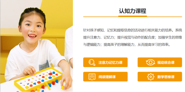 针对孩子感知、记忆和提取信息的活动进行相关能力的培养。系统提升注意力、记忆力;提升视觉与动作的配合度;加强学生的思维与逻辑能力;提高孩子的理解能力,从而提高学习的效率。