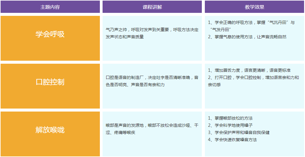 讲师均为播音主持系专业老师,有着多年授课经验。同时能将播音的专业技巧转化为普通人日常工作应用的能力。