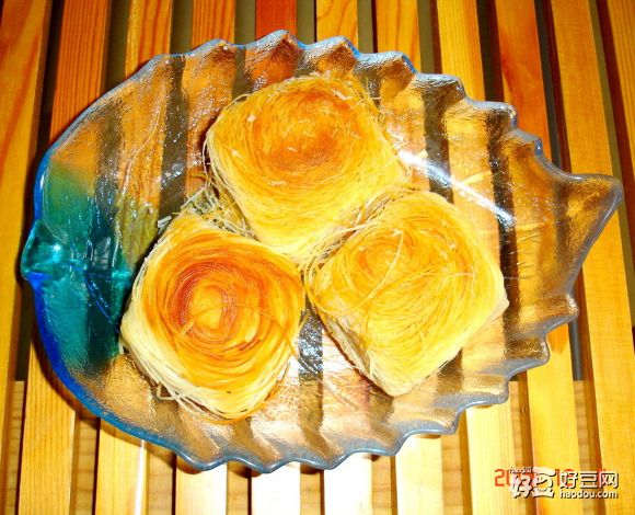 酥油饼用上 等白面粉搀和白糖,用花生油煎制而成。因饼开蒙茸有如蓑衣,所以杭人又呼之为"蓑 衣饼"。饼色金黄,食时,先时细白糖粉,入口时,松脆可口,颇具风味。数百年来凡 登吴山者,均以一尝吴山酥油饼为快事。今吴山茗香楼等处仍有供应。