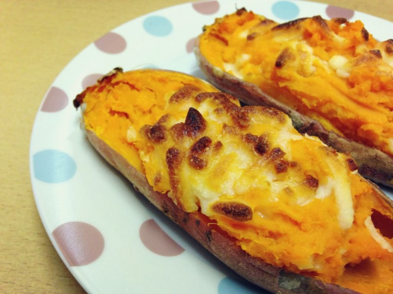 . 红薯洗净,对半切开,放蒸锅里蒸熟,用勺子将红薯瓤挖出,靠近红薯皮的地方留大概一厘米左右的厚度,将红薯瓤放到碗里,加一小块黄油,少许酸奶,适量炼乳拌匀(不用担心黄油不会融化,因为红薯很热,黄油放进去以后搅拌均匀也就完全的融化了)