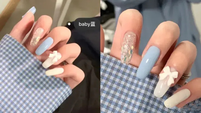 这个颜色太适合夏天了,而且baby蓝很显白,跳的乳白色软软糯糯的,小蝴蝶结也是可可爱爱,大拇指是baby蓝底部贴了四颗珍珠