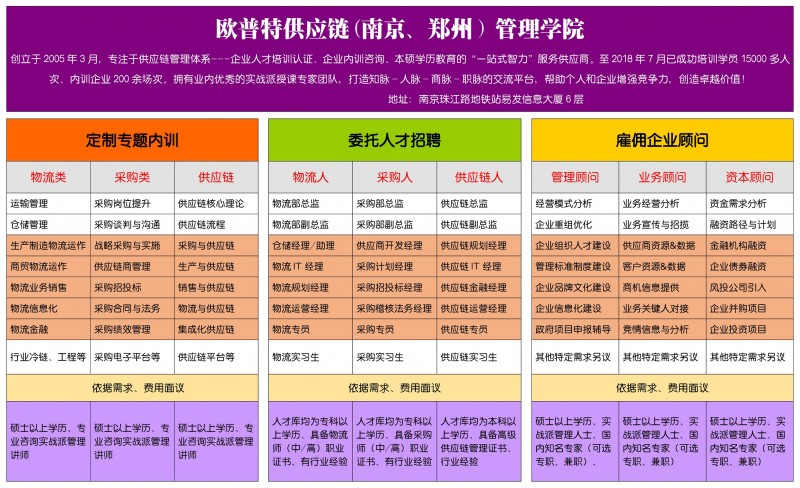 以上内容是关于欧普特供应链管理学院的有关介绍,如果您想了解更多关于南京供应链管理师、物流从业人员职业能力等级认证、物流职业经理人、ITC 采购从业人员能力等级认证等培训的相关内容,可以点击查看天天培训网企业管理栏目,也可以右上角电话联系我们或在线咨询客服。