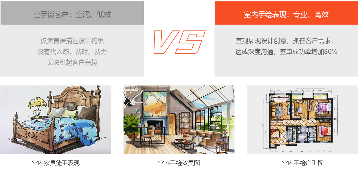 虽然现在大部分绘图被电脑软件替代,但徒手手绘能够在对接客户时,快速、-的抓住客户眼球,为设计师 创造-多的沟通机会与谈单成功率,所以行业内能否通过徒手手绘表达设计方案, 是对设计师能力的重要衡量标准。