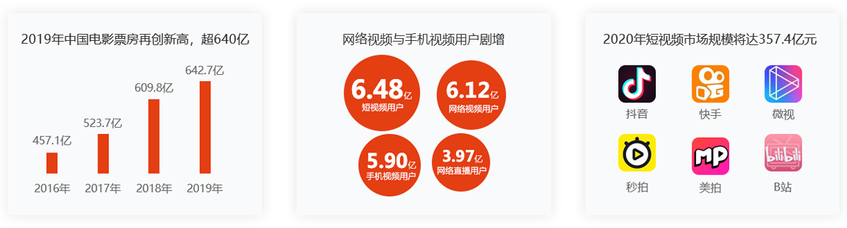 2019年中国电影票房再创新高,已连续9年处于稳步增长态势,直播、短视频等新平台的用户大量增长,为影视领域补充了大量的生力军。2019年5G顺应需求而来,因为 其网速极快、延迟低、超大容量等特点,支持超高清视频、超流量直播等视听服务,势必会吸引-多的用户加入其中,引爆影视流量红利。